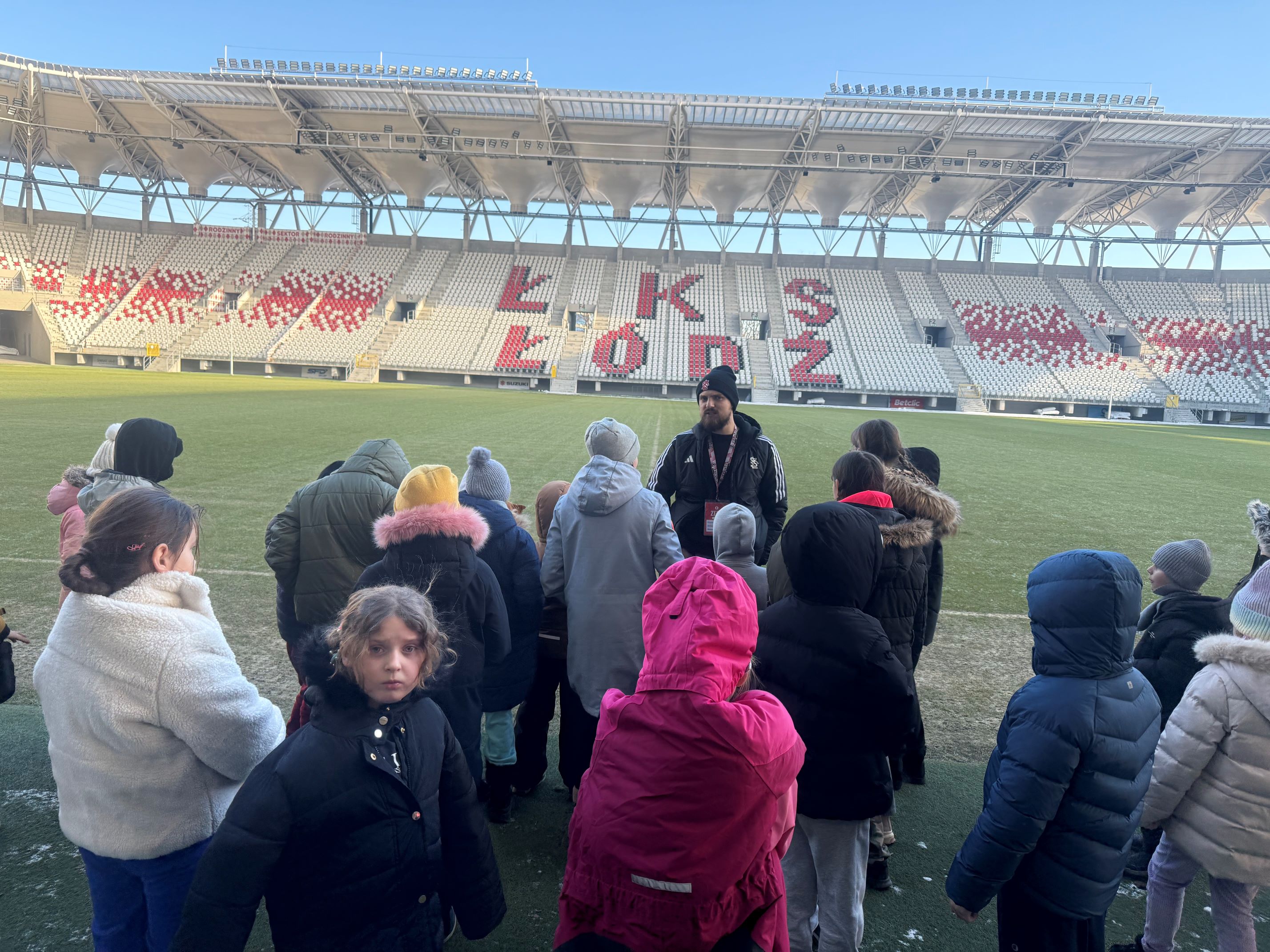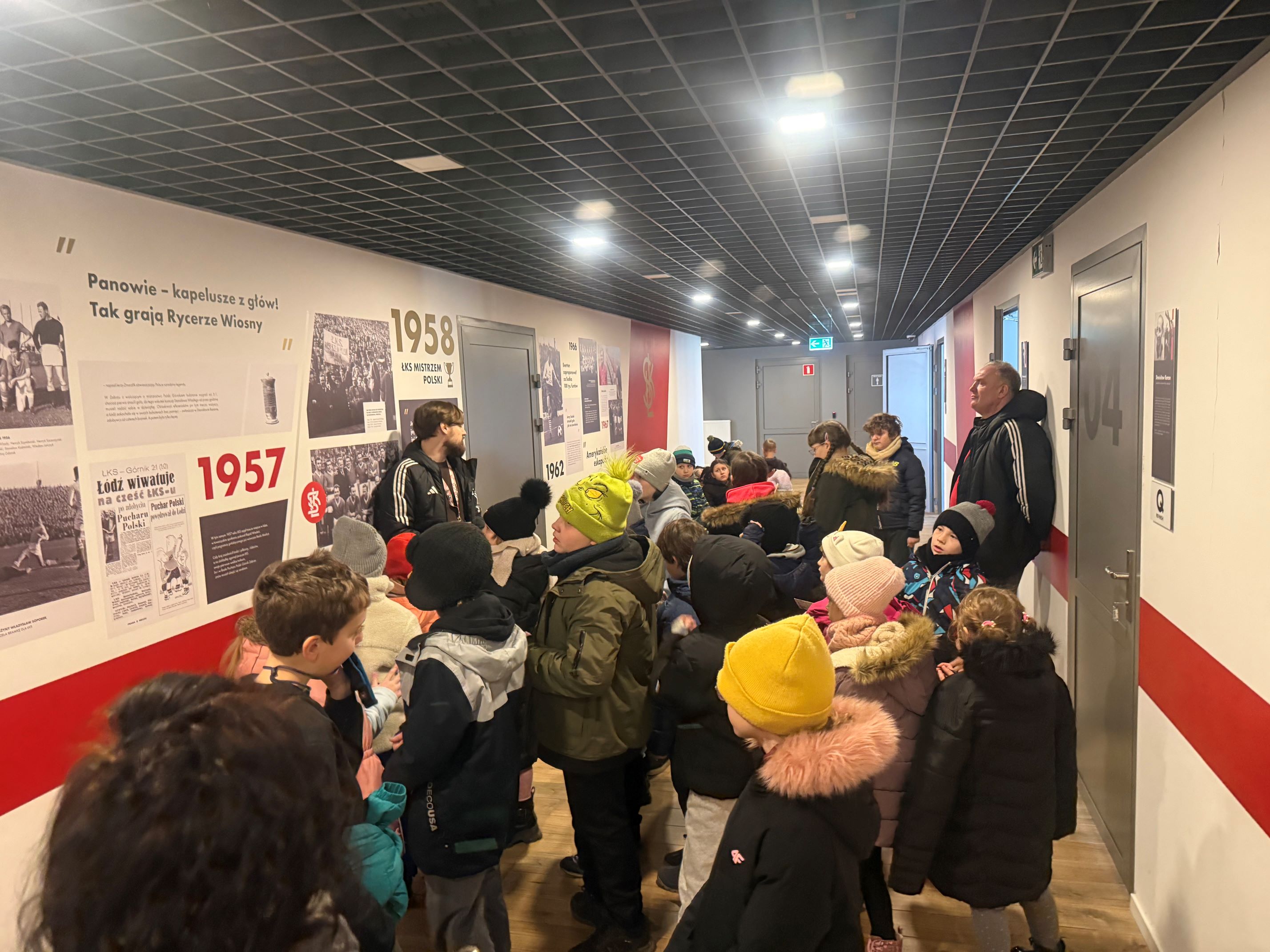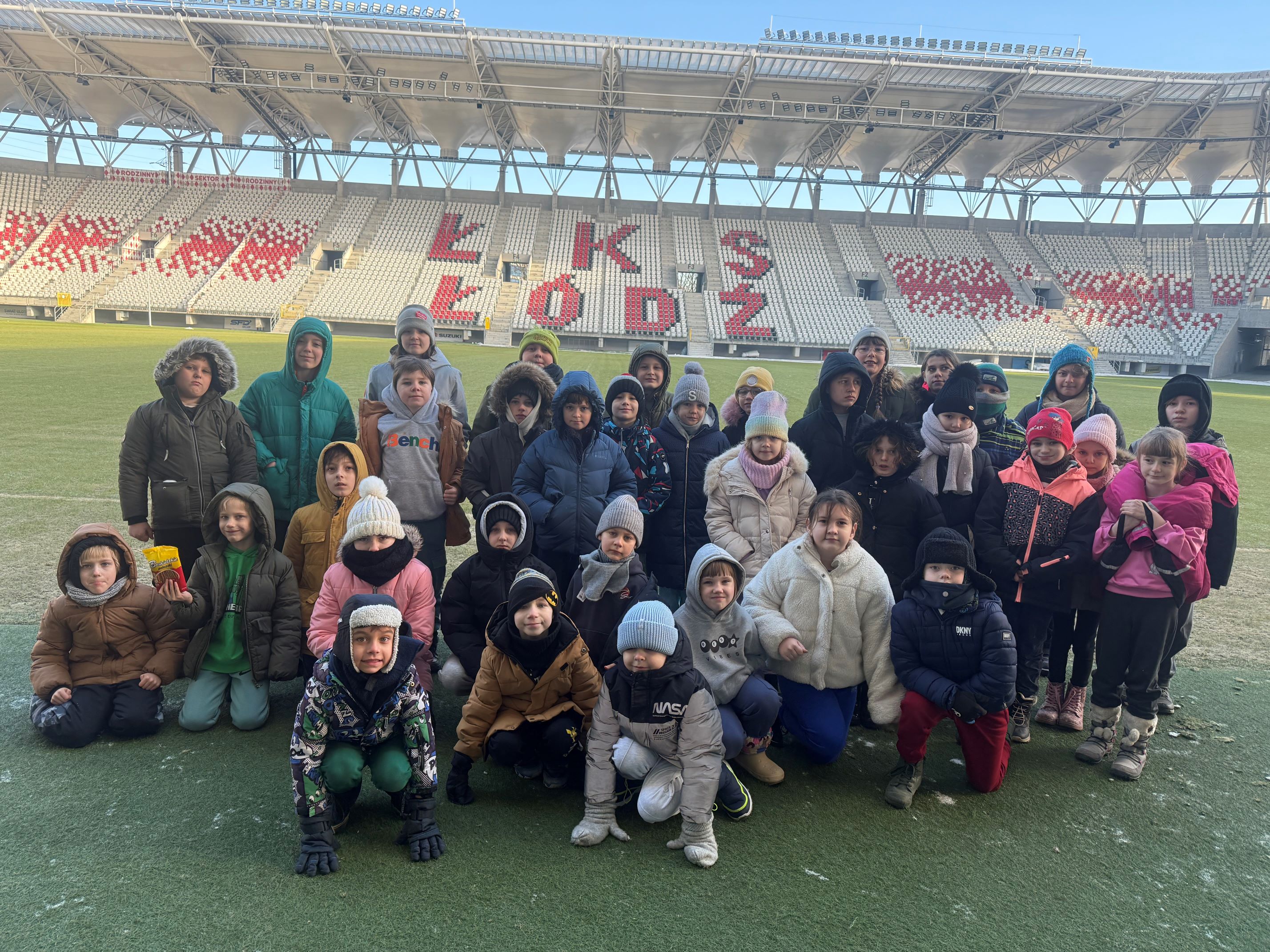 Naszą przygodę rozpoczęliśmy od zwiedzania stadionu ŁKS oraz spotkania z zawodnikami klubu. Dzieci miały okazję wejść na murawę i zasiąść na ławce rezerwowych, co wzbudziło wiele emocji. Następnie uczestnicy spotkali się z trzema piłkarzami pierwszej drużyny – Mateuszem Wzięchem, Mateuszem Kupczakiem oraz Łukaszem Bombom – z którymi mogli porozmawiać i zadać pytania.