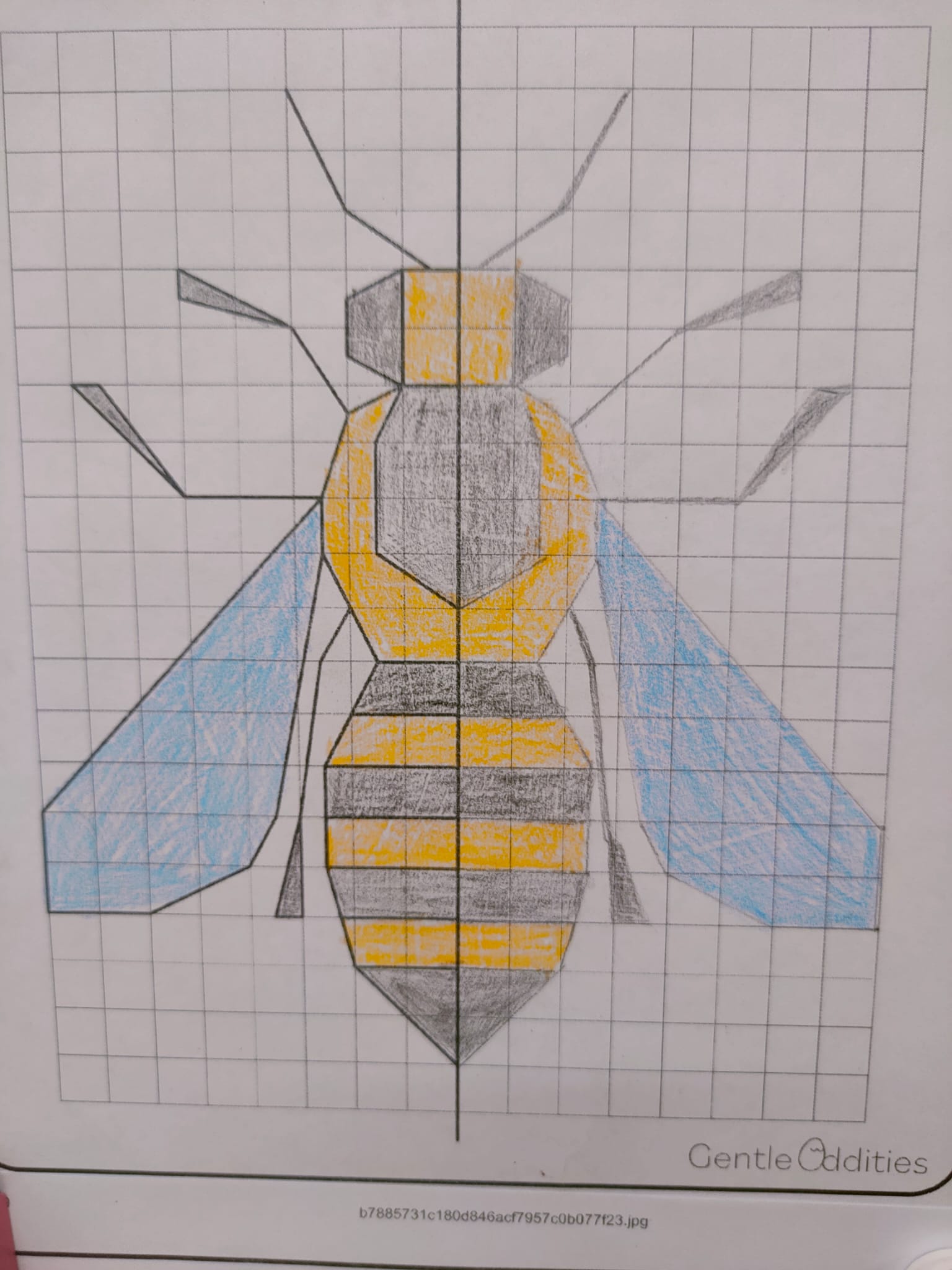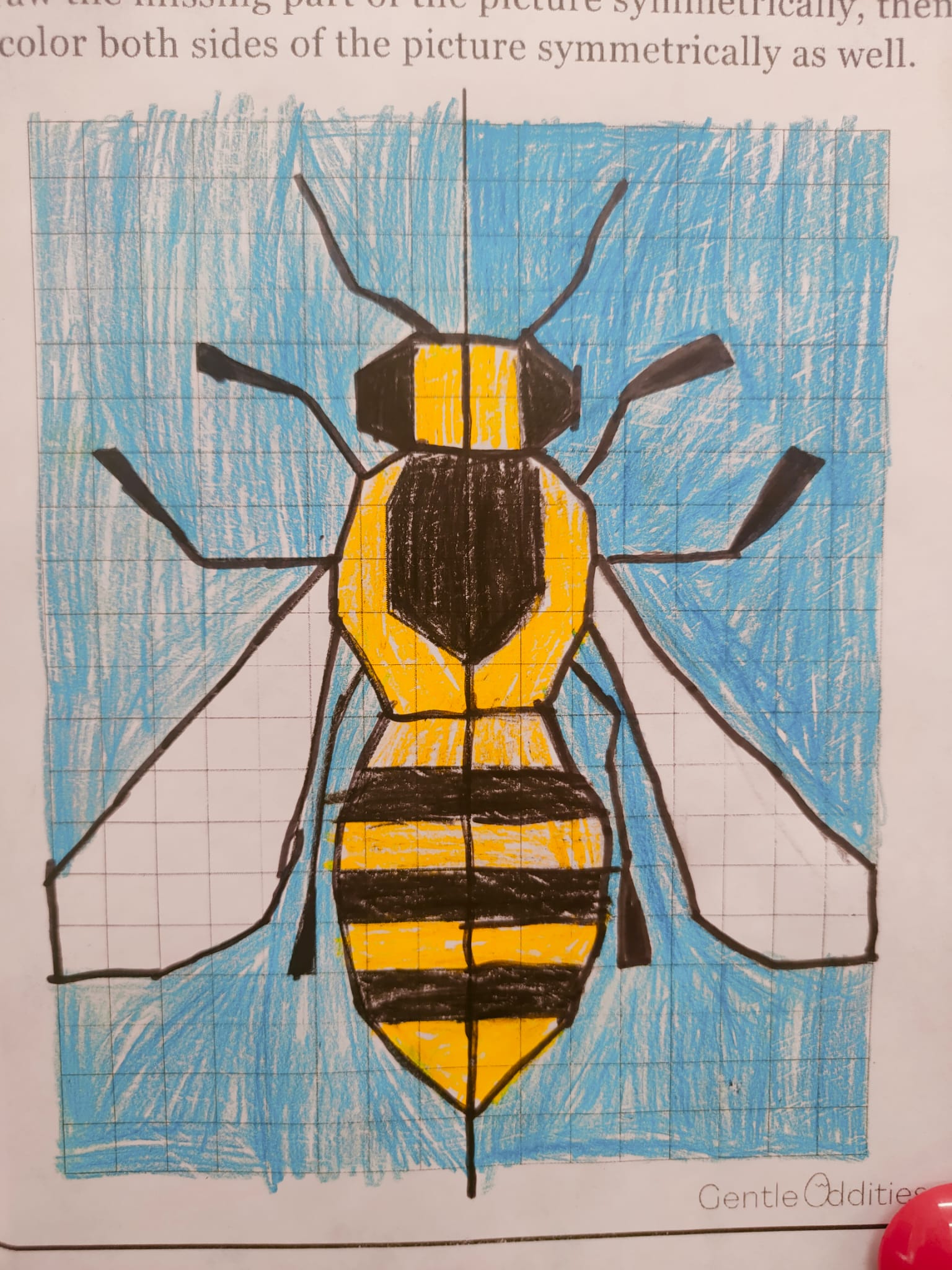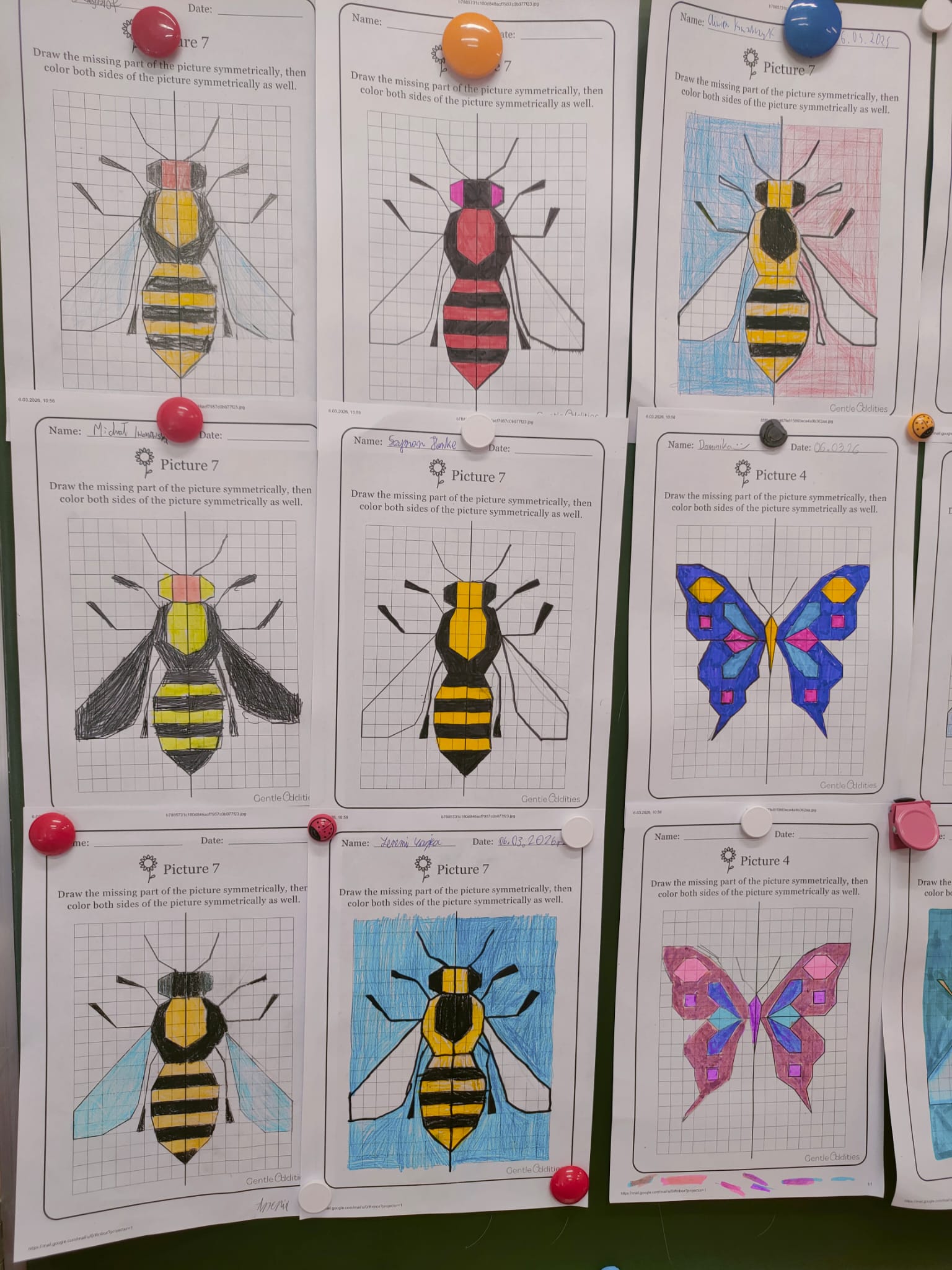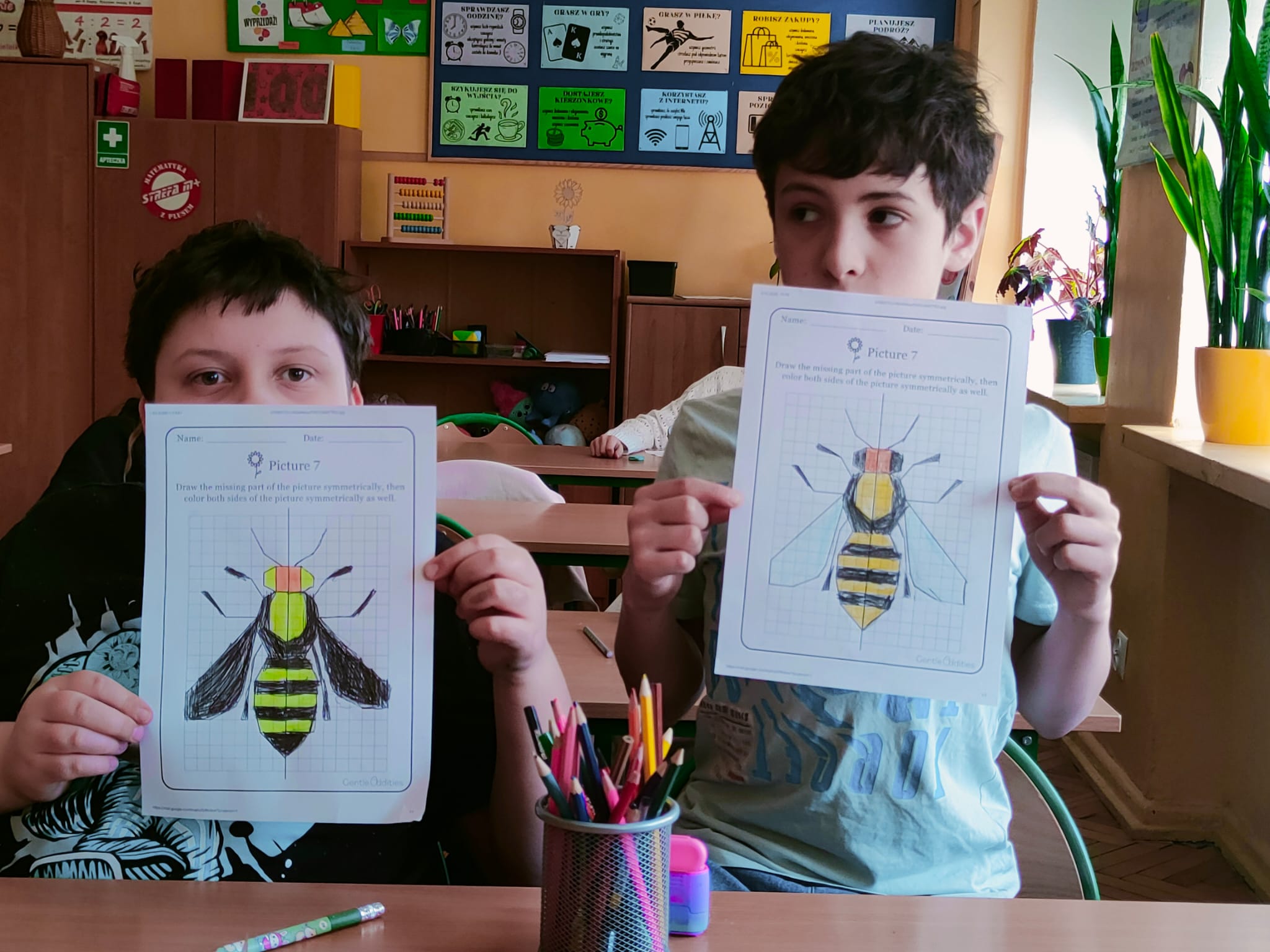 Głównym zadaniem uczniów było stworzenie idealnie symetrycznych rysunków motyli oraz pszczół. Wykorzystując jedynie kredki i flamastry, dzieci musiały z niezwykłą starannością odwzorować drugą połowę skrzydeł owadów tak, aby stanowiły one perfekcyjne lustrzane odbicie pierwszej części. To ćwiczenie pozwoliło im w namacalny sposób zrozumieć, czym w praktyce jest oś symetrii oraz jak wielką rolę odgrywa ona w harmonii natury. Każda kropka na skrzydle motyla i każdy pasek na odwłoku pszczoły stały się dowodem na to, że matematyka jest fundamentem piękna. Efektem tej kreatywnej lekcji jest wspaniała kolekcja prac, która pokazuje, że połączenie nauki z zabawą przynosi najlepsze rezultaty. Właśnie na taką matematykę – angażującą, twórczą i bliską rzeczywistości – stawiamy w naszej szkole.