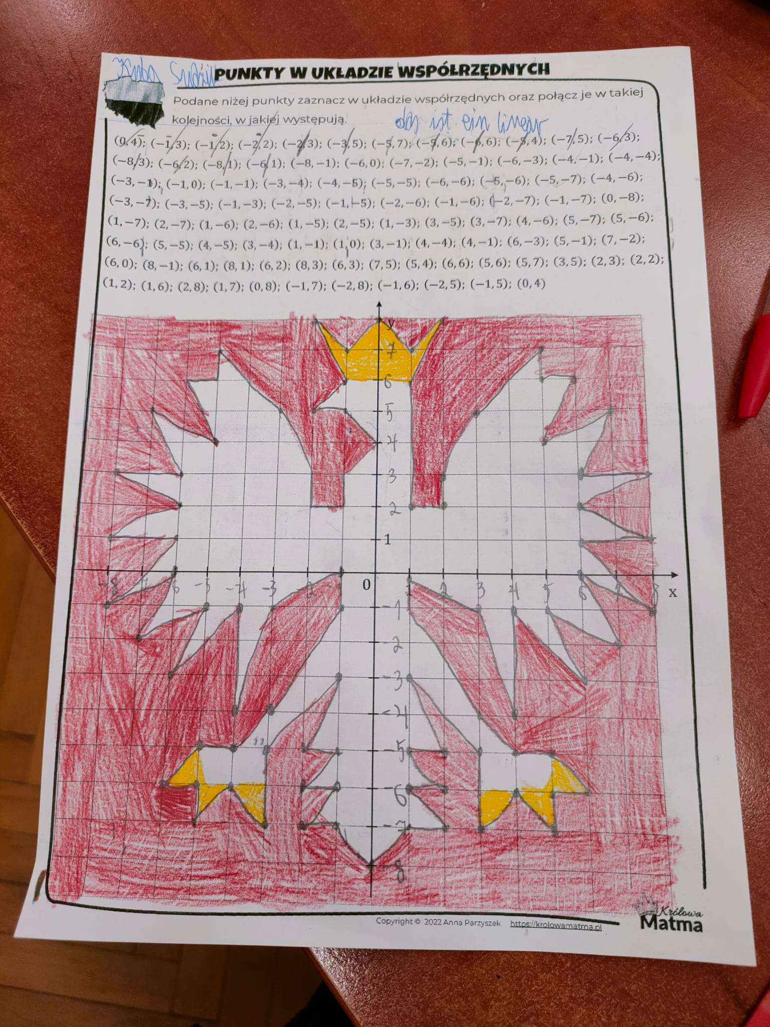 Klasa 7 tworzyła w układzie współrzędnych kontur orła. Powstały bardzo precyzyjne i efektowne rysunki. Uczniowie rozwiązywali także zadania procentowe nawiązujące do tematyki święta, a przy okazji pojawiły się różne matematyczne herby i wizerunki orła.
