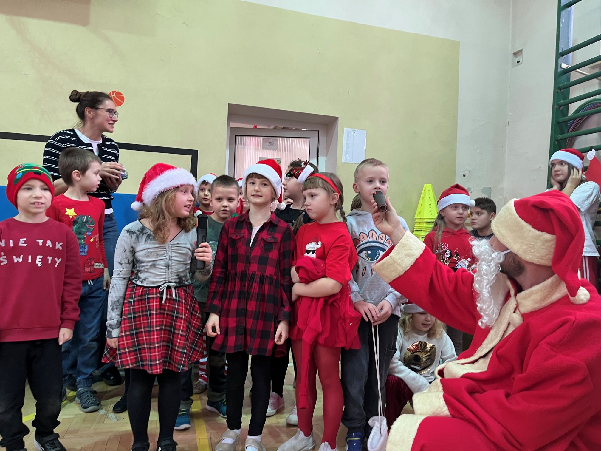 Mikołaj szybko dał się porwać rytmom muzyki i zatańczył z naszymi uczniami niejedną piosenkę. Po wspólnej zabawie rozpoczęło się długo wyczekiwane rozdawanie prezentów dla wszystkich klas. W ramach podziękowania uczniowie zaśpiewali dla Mikołaja świąteczne piosenki, tworząc wyjątkowy, pełen radości klimat.