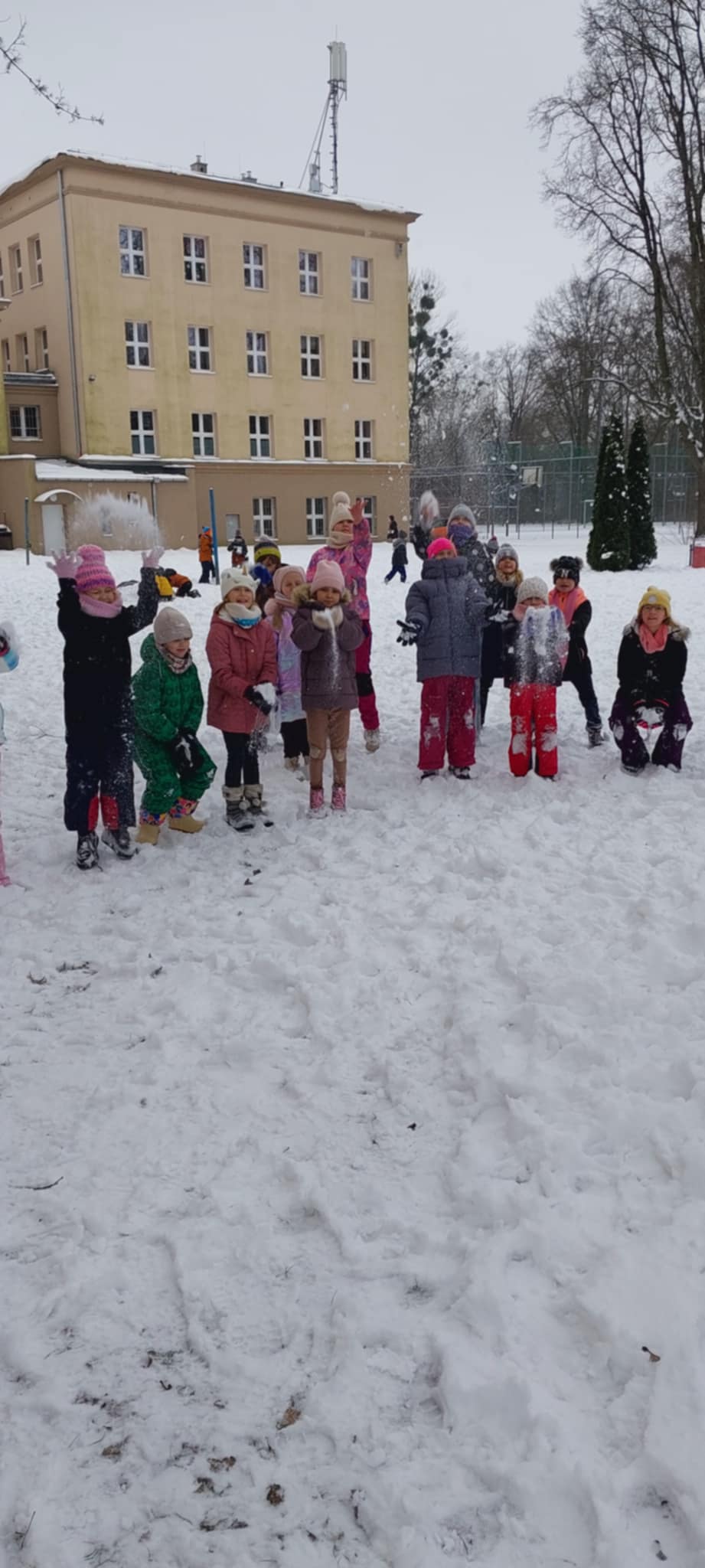Dzieci z klas 1–3 wzięły udział w radosnych zabawach na śniegu. Podczas zajęć na świeżym powietrzu uczniowie budowali różnorodne budowle ze śniegu, rozwijając swoją wyobraźnię i współpracując w grupach. Powstały m.in. bałwany, zamki oraz fantazyjne rzeźby.
