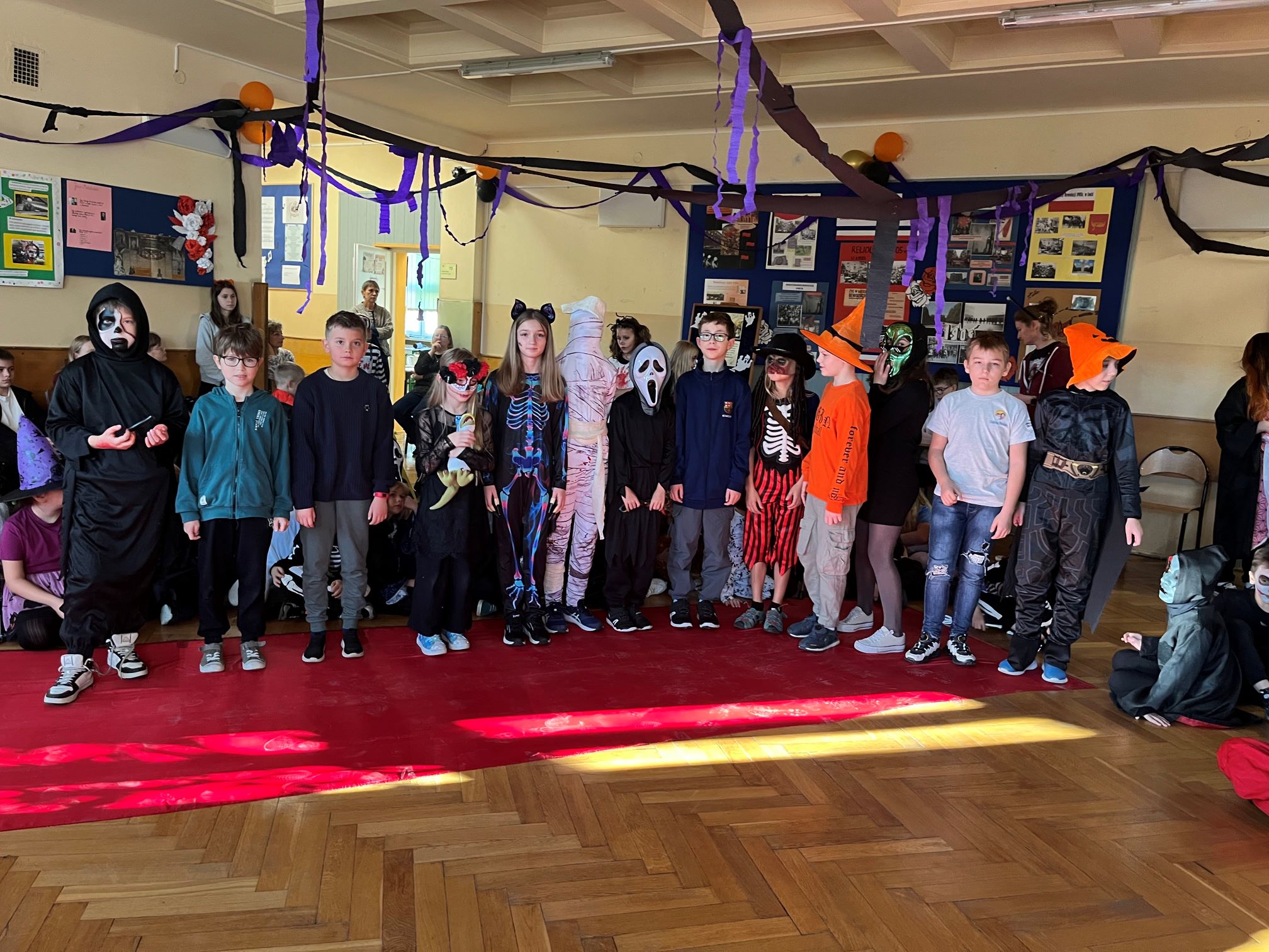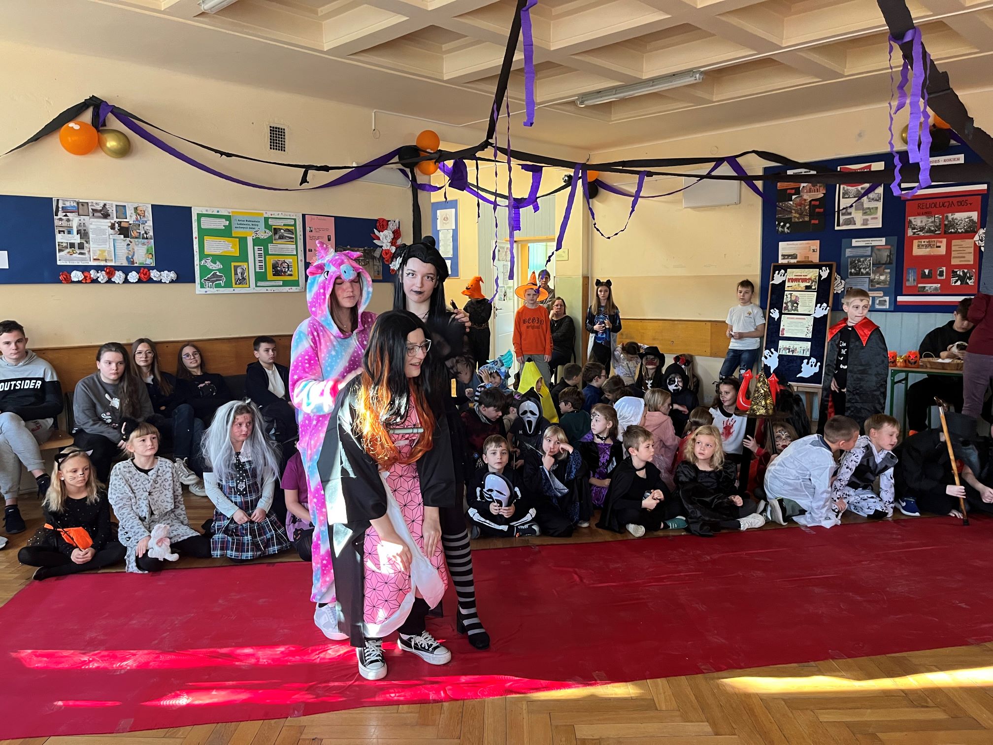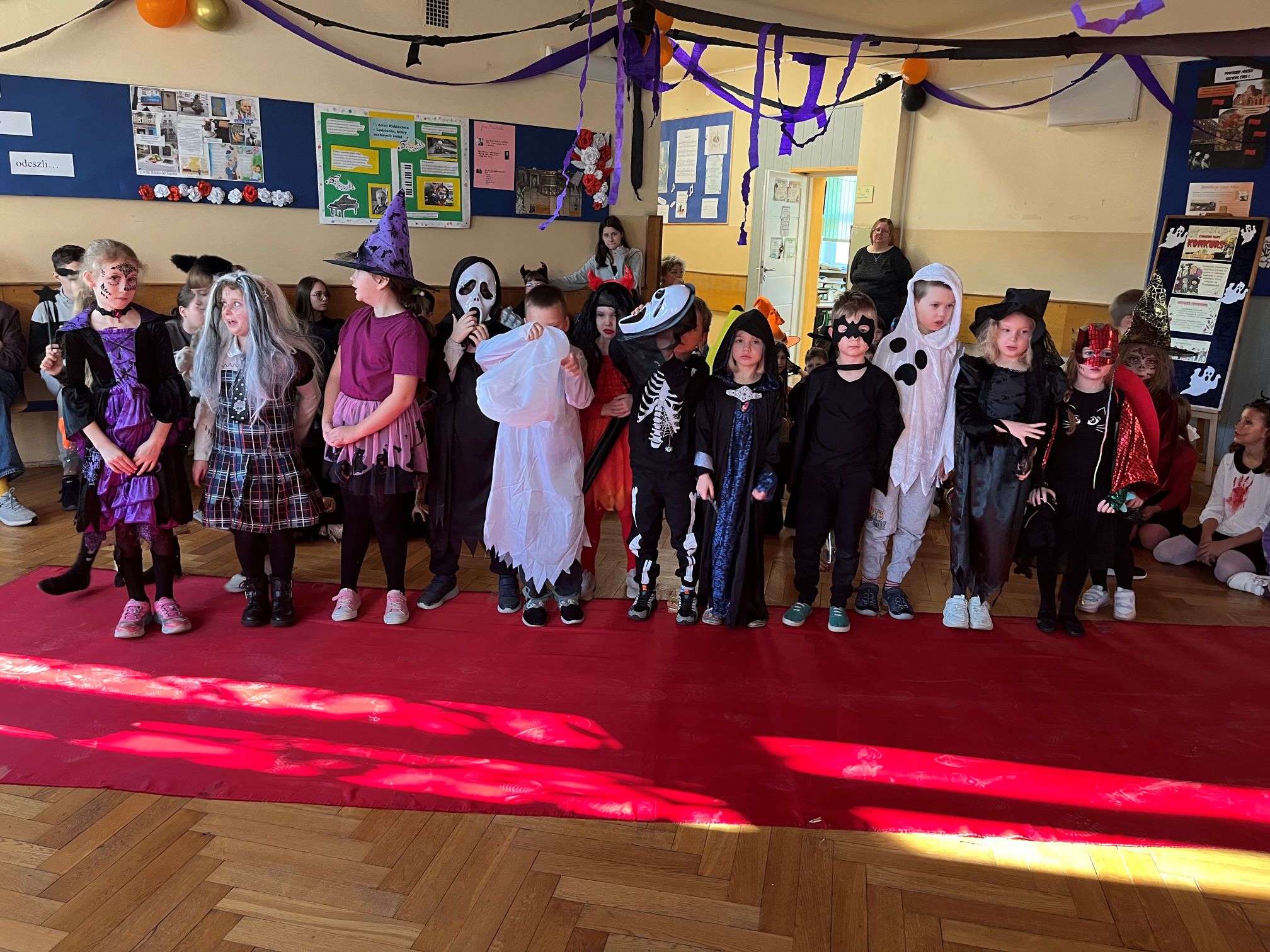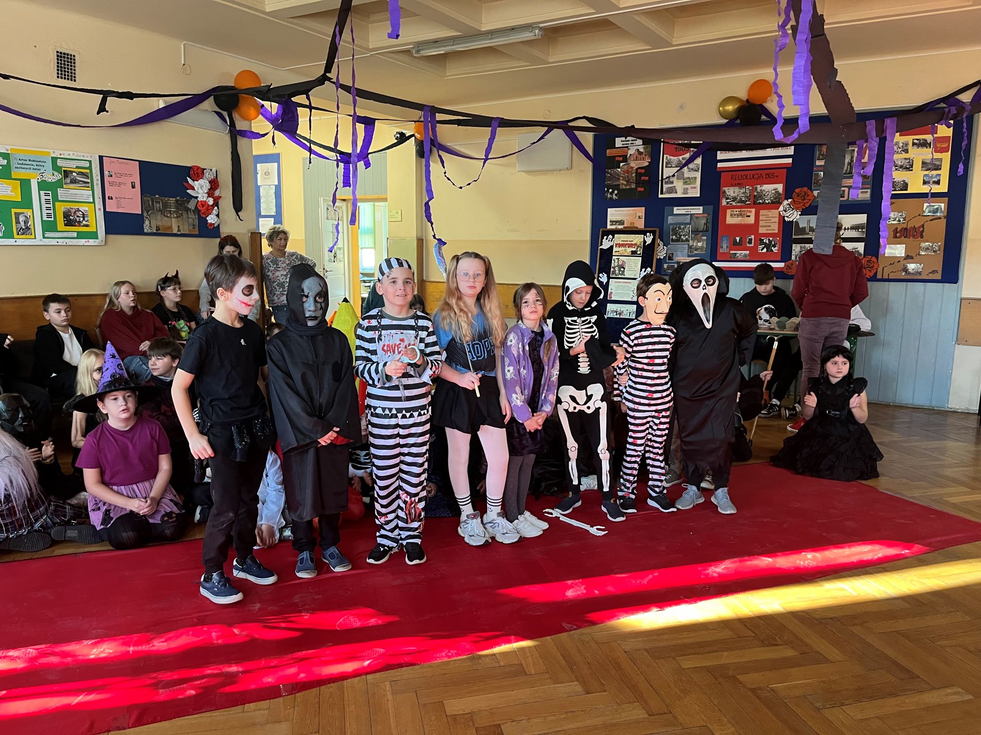 Na początek zorganizowany został konkurs na najstraszniejszy strój halloweenowy w dwóch kategoriach: klasy I–III oraz IV–VIII, a także na najstraszniej przebraną klasę. Uczniowie prezentowali swoje pomysłowe przebrania na specjalnie przygotowanym „czerwonym dywanie”. Wśród uczestników pojawiły się duchy, upiory, czarownice, więźniowie i wiele innych przerażających postaci!