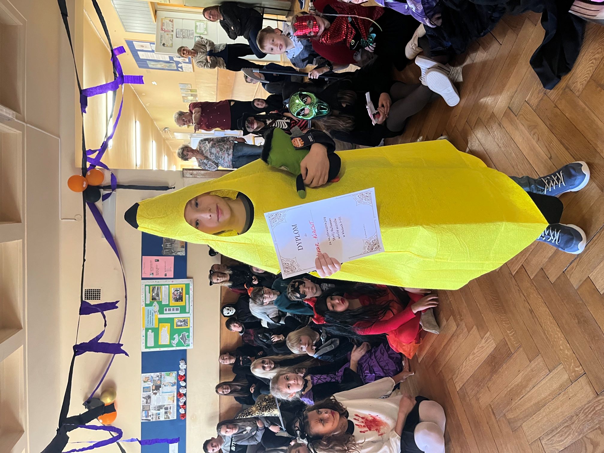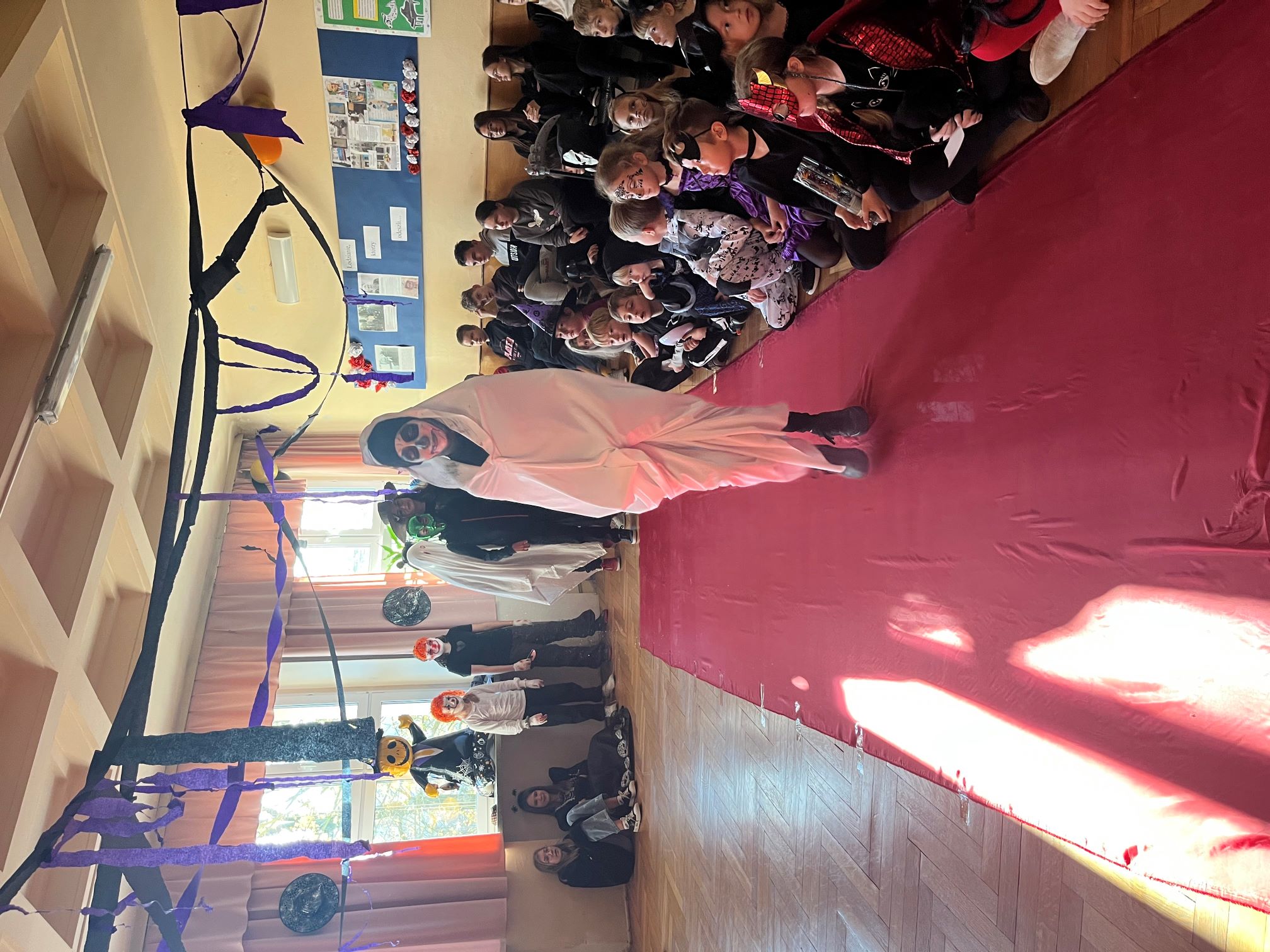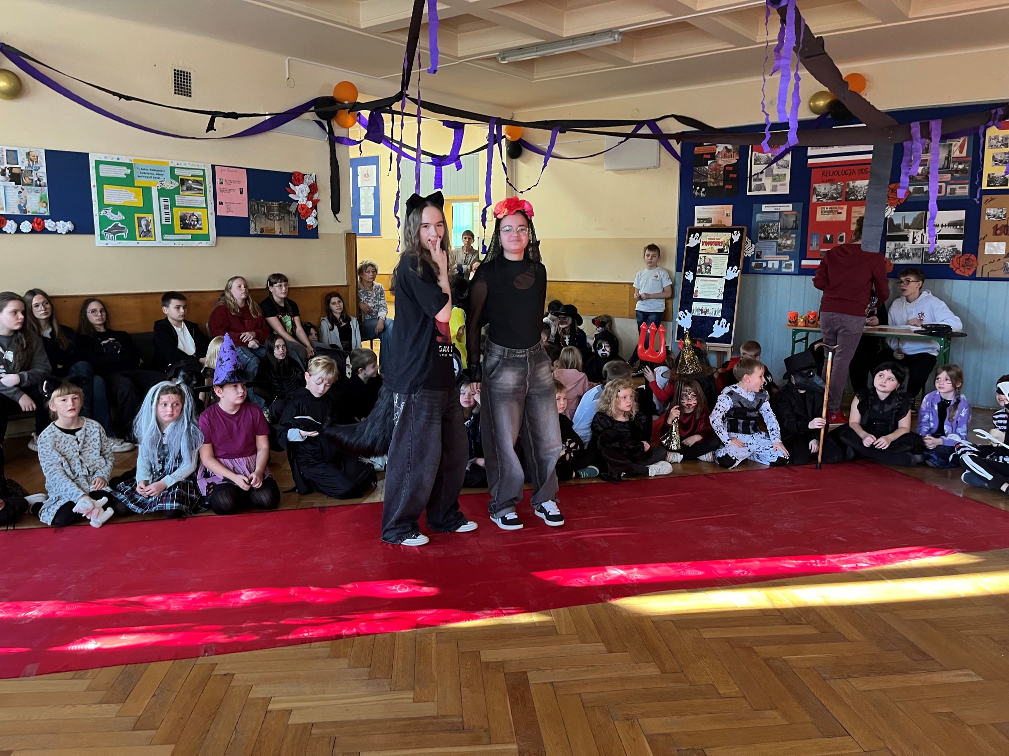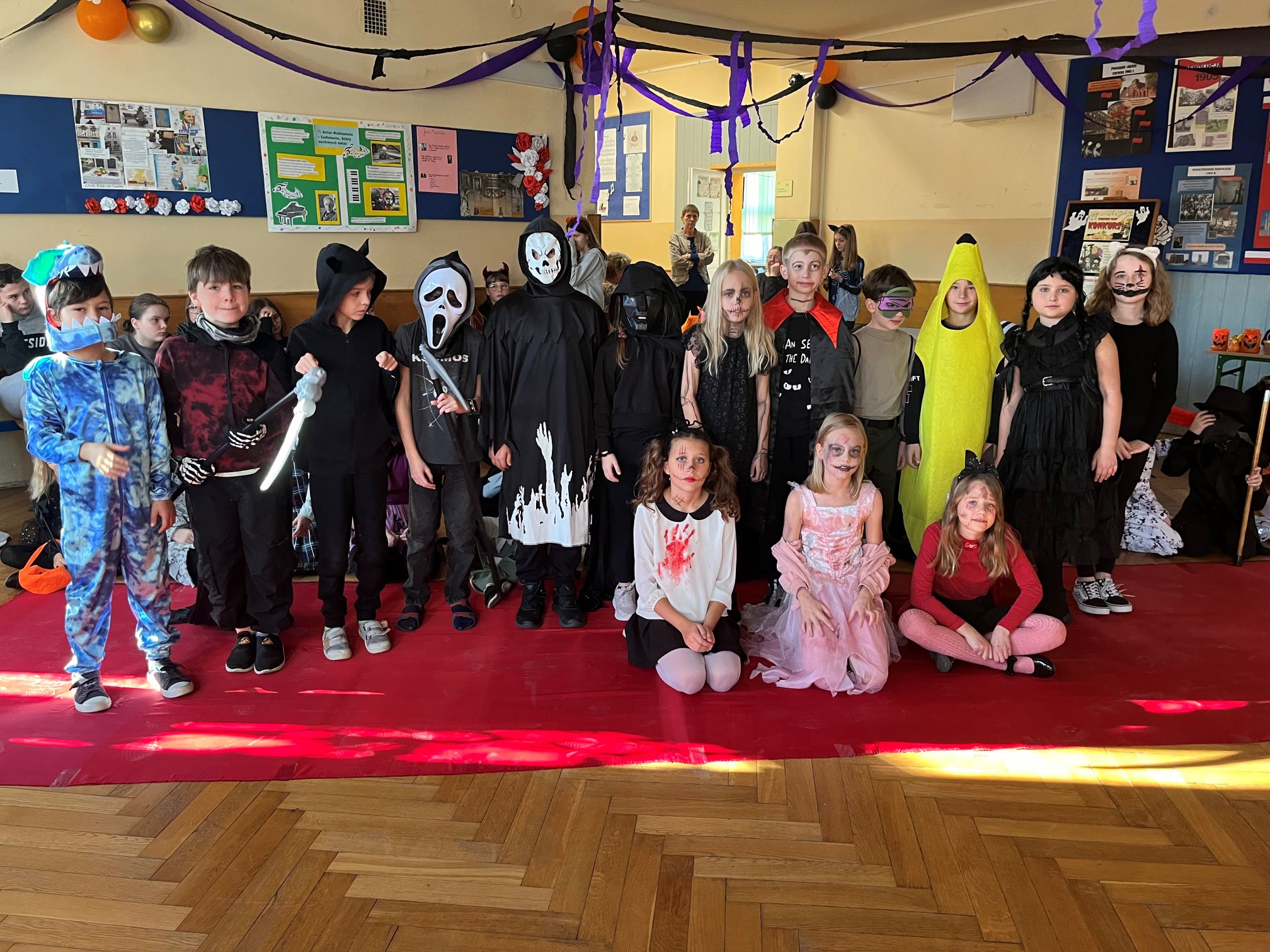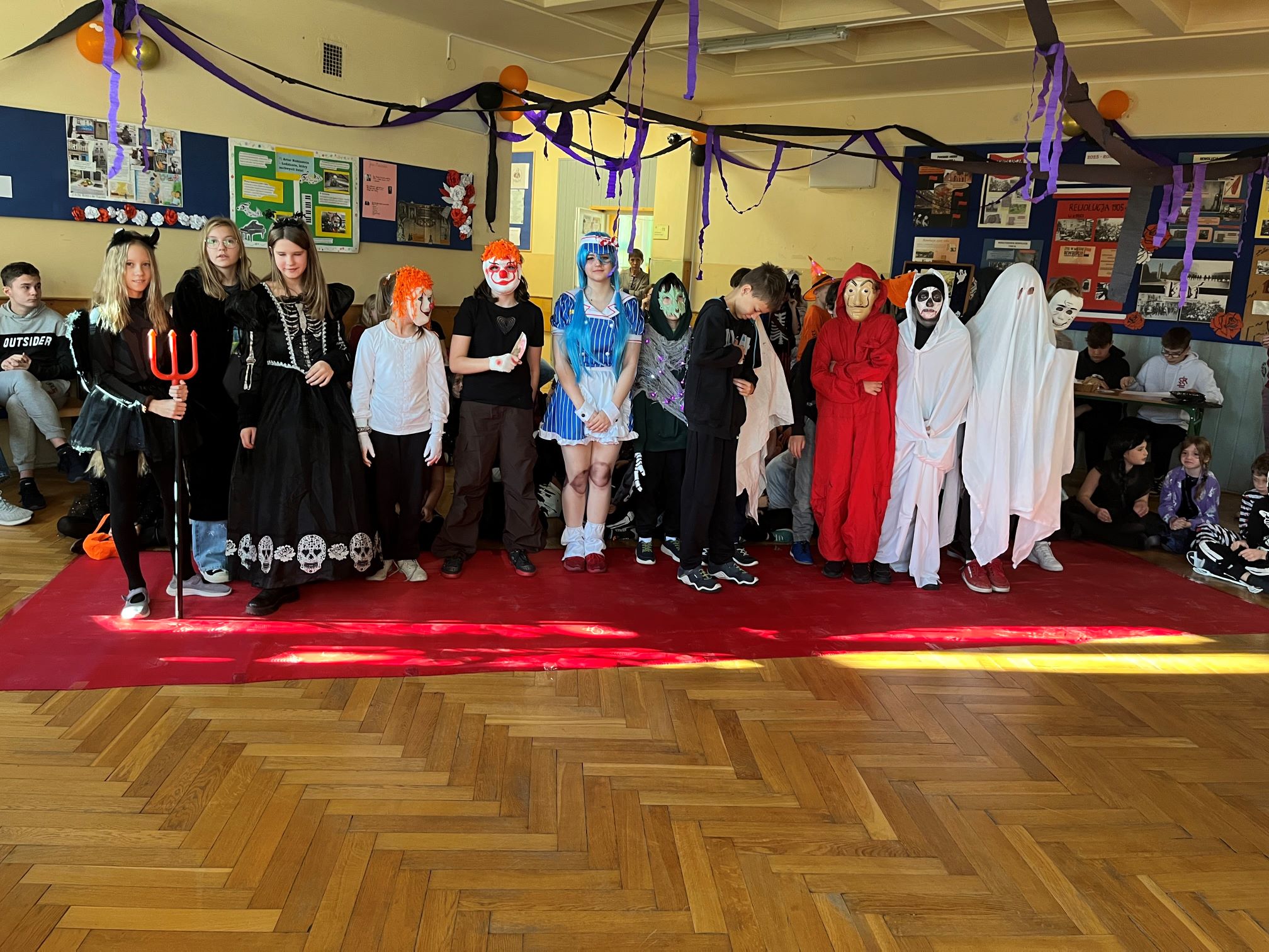 Na początek zorganizowany został konkurs na najstraszniejszy strój halloweenowy w dwóch kategoriach: klasy I–III oraz IV–VIII, a także na najstraszniej przebraną klasę. Uczniowie prezentowali swoje pomysłowe przebrania na specjalnie przygotowanym „czerwonym dywanie”. Wśród uczestników pojawiły się duchy, upiory, czarownice, więźniowie i wiele innych przerażających postaci!